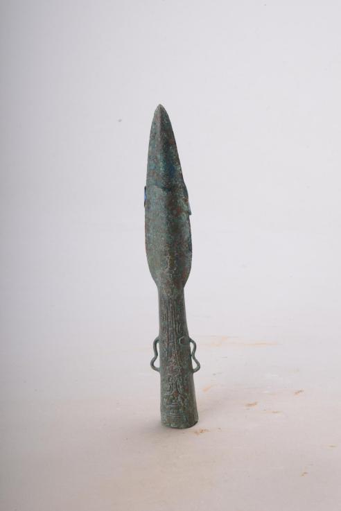 圆形銎口,长骹,圆拱形背,翼窄且修长,三角形前锋。骹中部附对称双弓形耳,上部饰一卷云雷纹,两面饰对称饕餮、蝉纹。