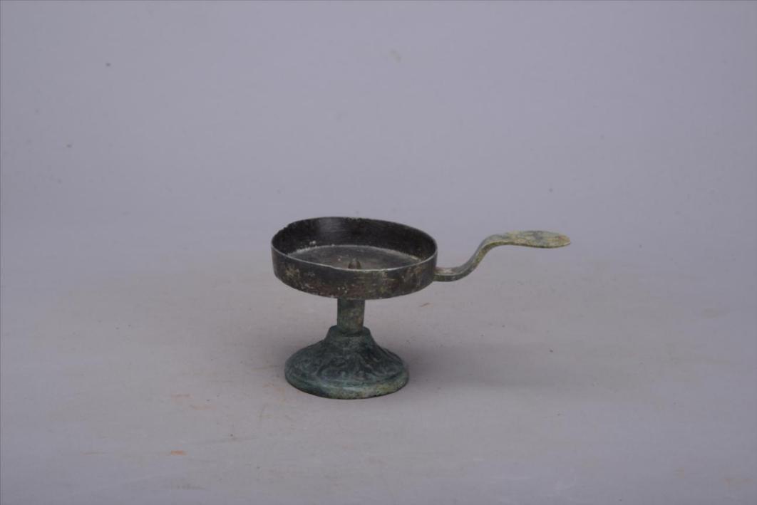 圆形直口,方唇,浅盘,盘中间有一锥钉,盘外壁底部附一扁执柄,柄弯曲,喇叭形底座,底座与盘有一圆柱相连接,底座有一浅浮雕图案。