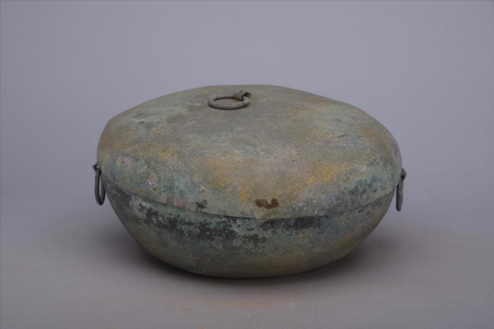 敛口,方唇,子母口,弧腹,平底。上口沿对称饰一对锥环,盖顶近平,中央有一系环。
