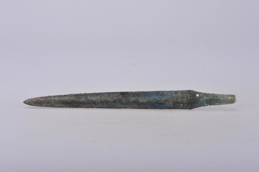 扁茎,茎上有两穿,其中一穿在中轴线上,靠近刃部一穿偏向一侧,剑身薄而狭长,中有窄脊较圆浑且延伸至茎部,剑身阴刻手心纹。