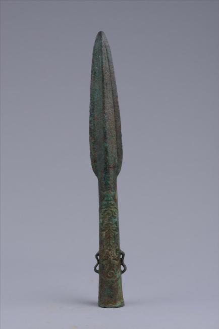 圆形銎口,长骹,三棱形背,翼薄修长,双刃,三角形前锋,骹部附双弓形耳,骹部饰虎纹等巴蜀符号。
