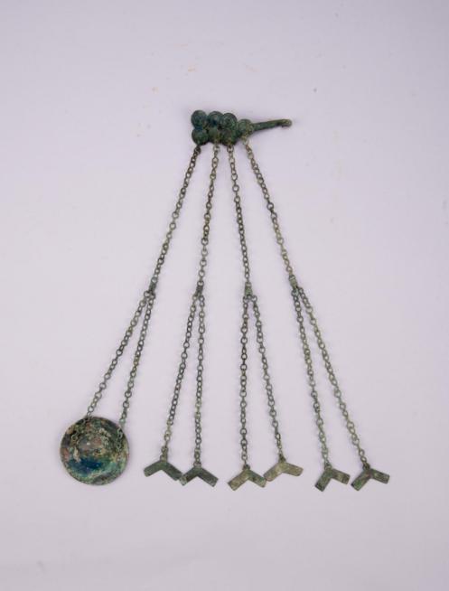 钩首呈鸭首状,钩尾为7个圆形钮作两层排列,钮面阳刻涡纹。下层分系4组链条,每组链条中部又分系2组链条,链条底端悬挂桥形装饰物和一圆形装饰物。
