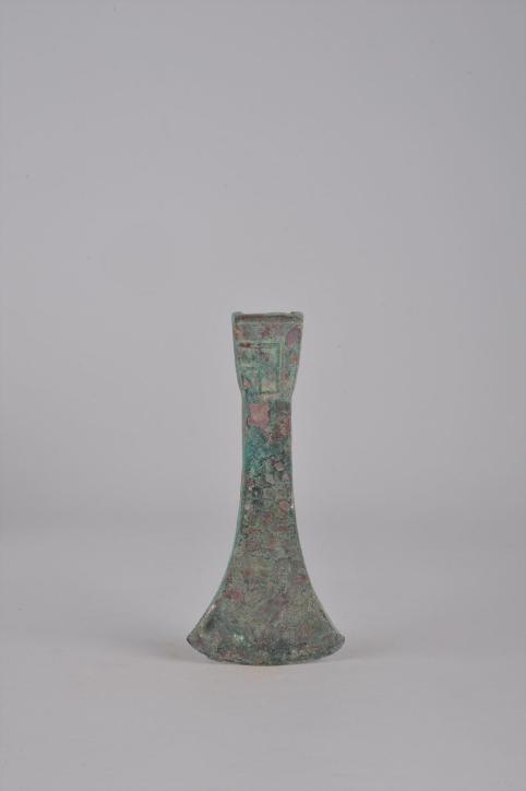 长方形銎,曲腰双面弧刃,略宽于銎身,銎身对称饰“┓”纹饰。