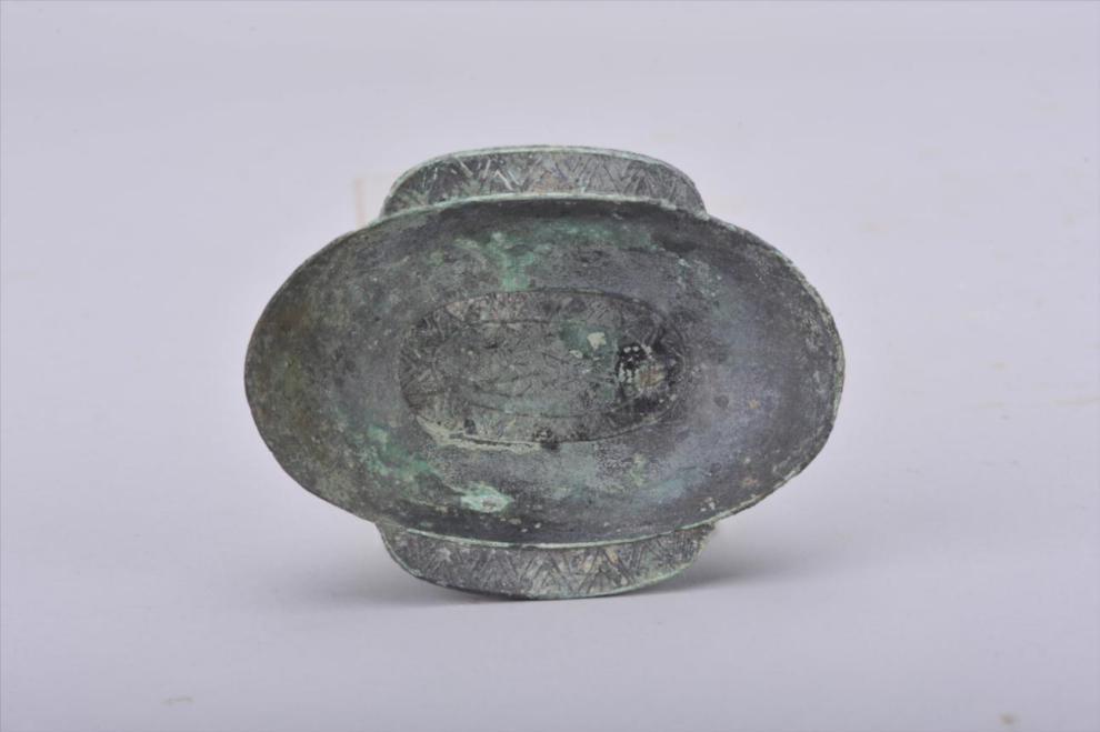 平面呈椭圆形,敞口,方唇,斜弧壁,腹较深,椭圆形平底,口两侧各有一月牙形耳,耳上饰菱格纹,内底饰鱼纹。