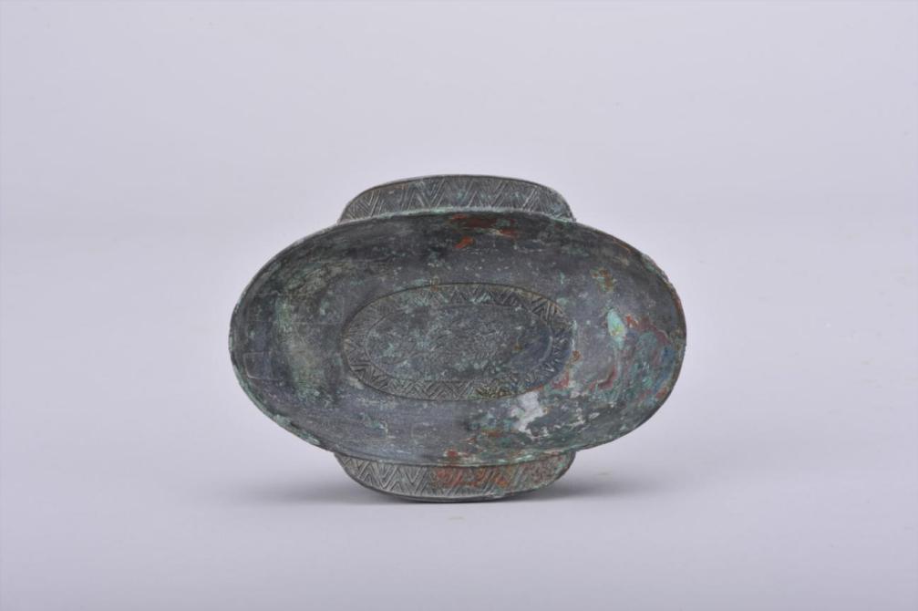 平面为椭圆形,敞口,方唇,两侧各有一月牙形耳,腹部圆收。两耳上饰波浪纹,杯底饰一周波浪纹,中央饰一鱼纹。