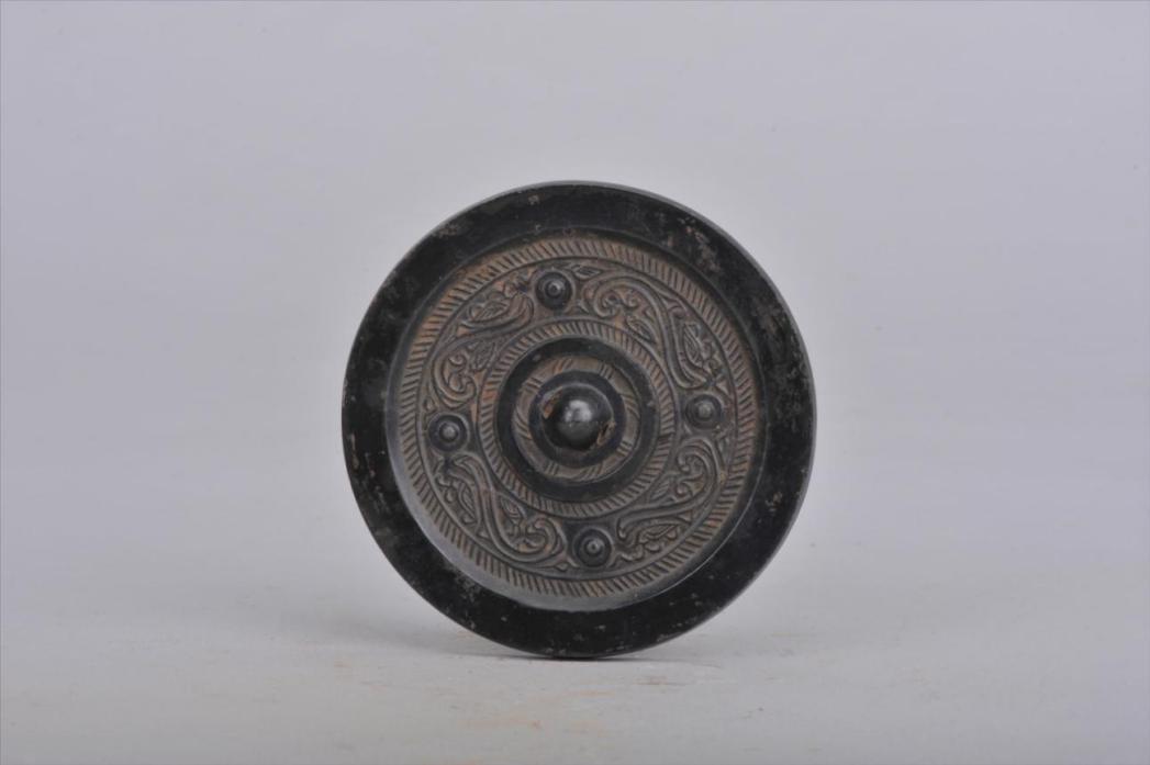 铜质铸造。圆形,镜面较平,宽沿,镜背中央为半球形圆纽,中有穿孔,以纽座位为中心平均分布四乳四螭纹,器身较厚。