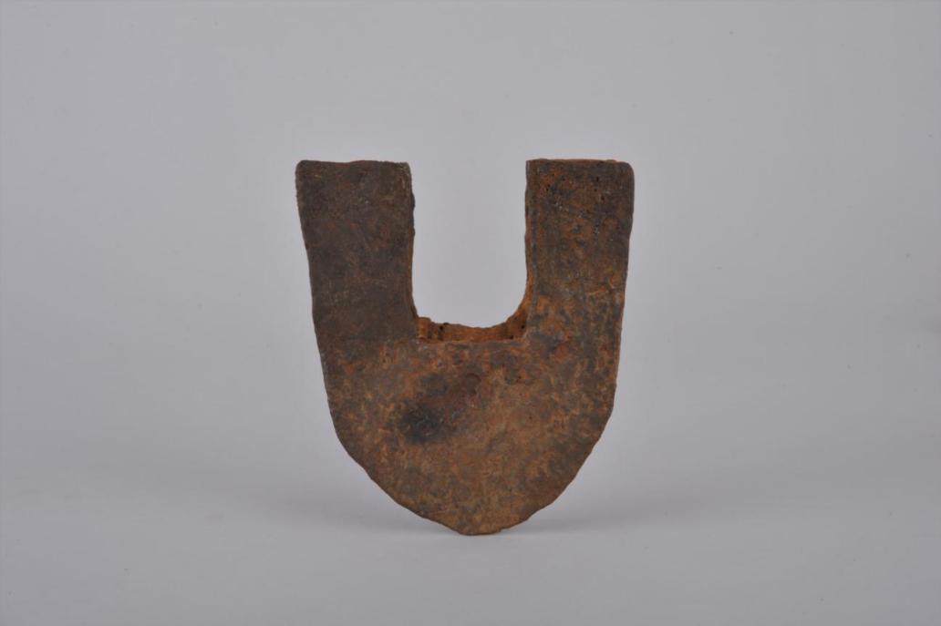 铁质铸造。平面呈凹字形,凹形銎口,宽弧刃,与銎口平齐。